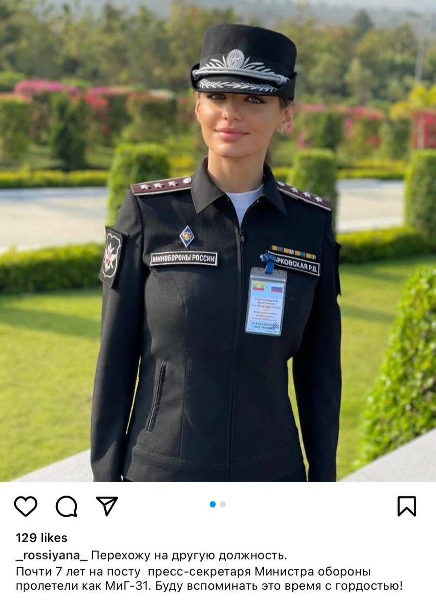 Эта девушка с погонами "трижды майора" - Государственный советник Российской Федерации 3-го класса пресс-секретарь министра МО Россияна Марковская. Девушка сообщила о своем увольнении своим подписчикам в запрещенном Инстаграм. Instagram входит в корпорацию Meta, признана экстремистской и запрещена в России. Собственно, это демонстрирует отношение некоторых должностных лиц к запретам в правовом поле Российской Федерации. Марковская трудоустраивается в Совет Безопасности РФ, как и многие из этих замечательных людей. Такие кадры, с бесспорными достоинствами, без работы не остаются. Ранее, заявление на увольнение по собственному желанию написала заместитель министра Обороны по экономике Татьяна Шевцова. Но, вероятно, Татьяну Викторовну освободят от должности только после того, как будет произведен аудит финансовой деятельности ведомства. Еще ранее министерство Обороны покинула Мария Китаева, ныне светская львица, последняя жена арестованного замминистра МО Иванова. По странному стечени