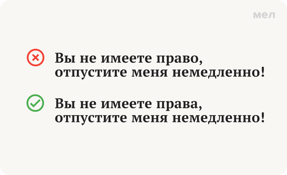 Сегодня разберем один из тех случаев, когда подсказкам интуиции лучше верить, чем нет: если вам хочется поставить существительное в форму родительного падежа — ставьте. Если не хочется — все равно ставьте, потому что это правильно. Правильно: не имеете права Вопрос здесь стоит так: какой падеж нужен при отрицании — родительный (кого? чего?) или винительный (кого? что?). Другими словами, должно ли меняться дополнение (в нашем случае слово «право») или оно может остаться таким, каким было. Ответ однозначен: падеж — родительный, дополнение — меняется. Писать нужно «вы не имеете права». Потому что есть правило, которое касается глаголов В этих глаголах после частицы «не» дополнение ставится в родительный падеж: Больше полезных карточек о русском языке — в «Грамотности» на «Меле» в Telegram. Подписывайтесь, чтобы говорить и писать правильно. Фото: Everett Collection / Shutterstock / Fotodom