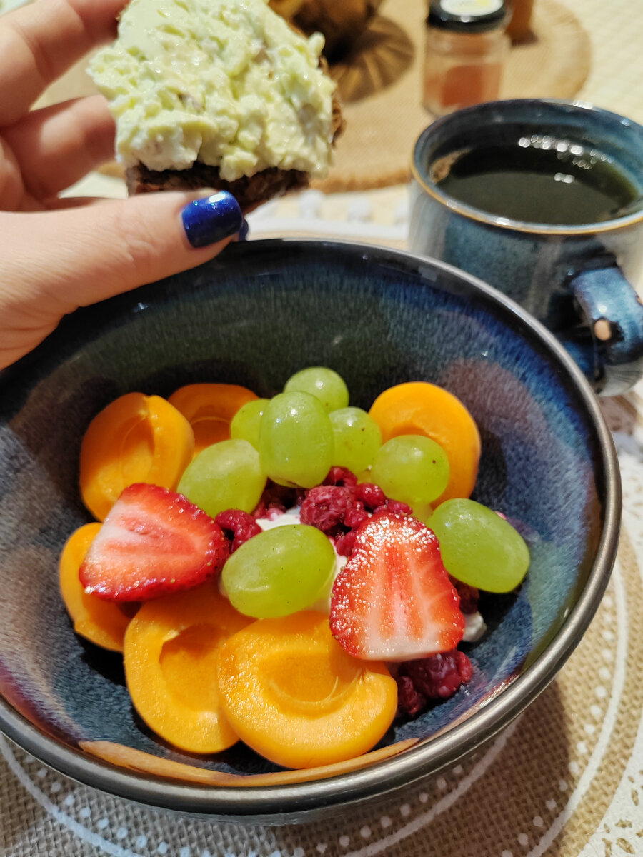 Творог со сметаной и ягодами, хлеб с кальмарной намазкой