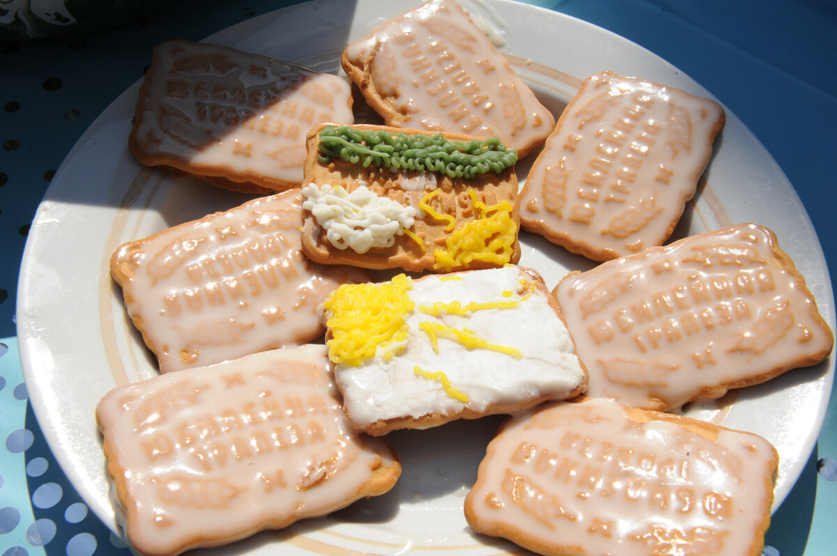 – Хочешь моё солнышко из глазури? – спрашивает мальчик с веснушками в поварском колпаке, показывая на печенье со сгущёнкой и цветной глазурью в виде солнца. – А ещё у меня есть оладьи, я их сам испёк.
