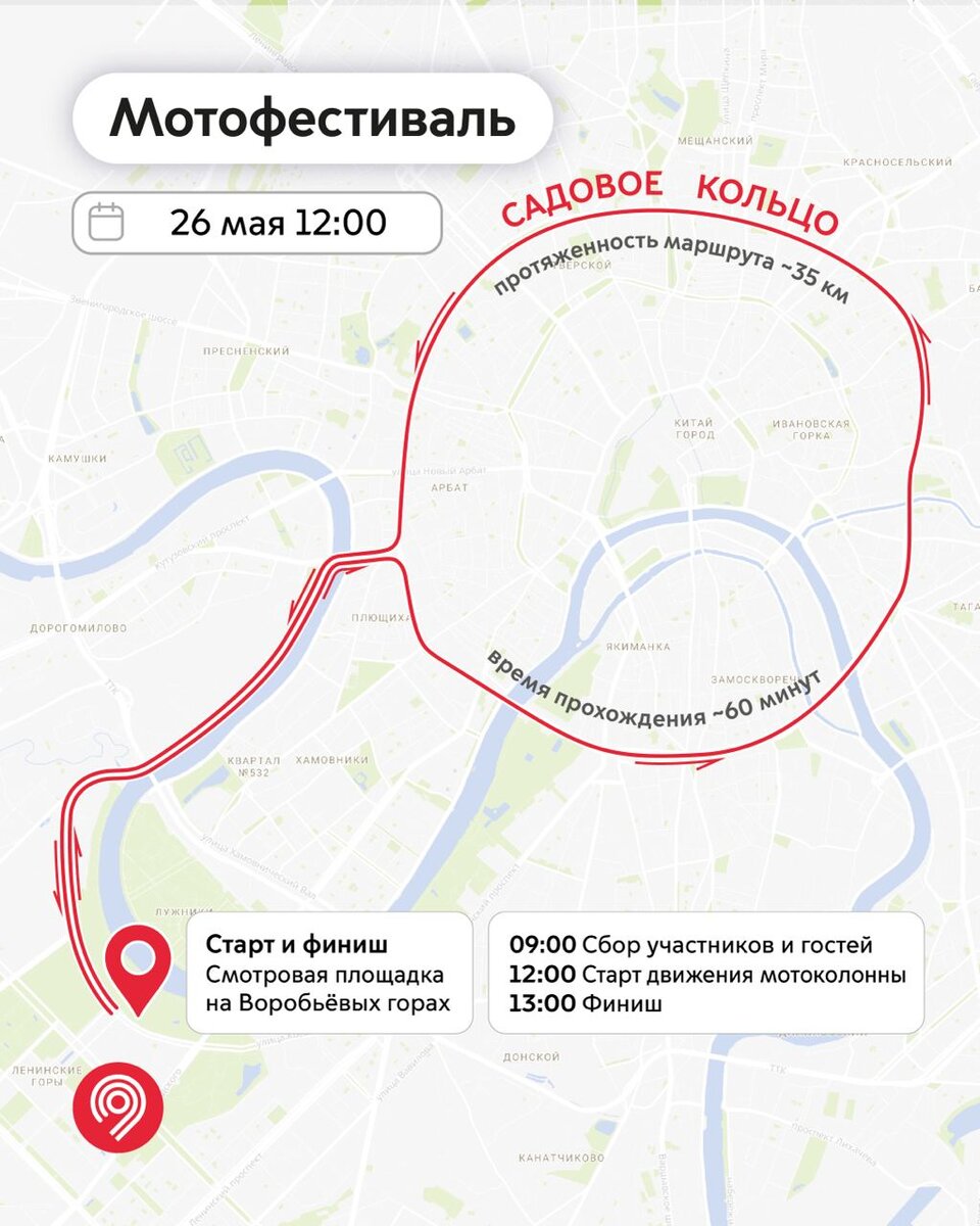Последние дни получаем сообщения от мотоциклистов и москвичей с просьбой перенести дату Московского мотофестиваля. 24 и 25 мая во всех школах страны для выпускников прозвучит последний звонок, и их родителям важно быть рядом в такой день. Мы прислушались к вашим просьбам и приняли решение перенести Мотофестиваль на 1 день — на 26 мая (воскресенье). Место встречи и старта не меняются. Расписание мероприятий на 26 мая остается прежним: 🔹 Сбор гостей и участников заезда — в 09:00 🔹 Старт мотоколонны — в 12:00 🔹 Развлекательная программа — до 18:00 Ждем вас на Воробьевых горах 26 мая!