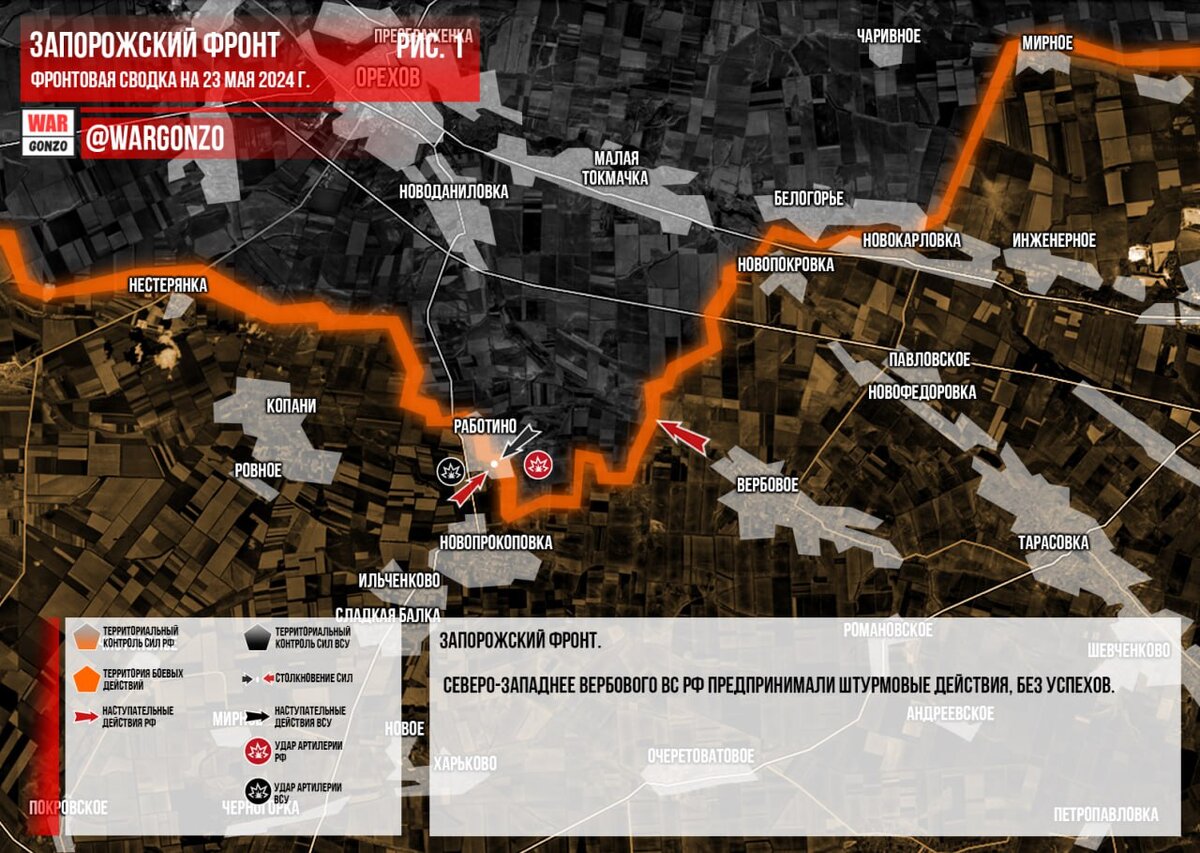 Запорожский фронт. Северо-западнее Вербового ВС РФ предпринимали штурмовые действия, без успехов. (Рис. 1) Донецкий фронт. Продолжаются штурмовые действия российских войск в Парасковиевке. В Красногоровке ЛБС без существенных изменений, продолжаются городские бои. В районе Нетайлово российские войска закрепляются на занятых рубежах на западной окраине населённого пункта. В Уманском в результате штурмовых действий российские войска смогли продвинуться в населённом пункте. В районе Очеретино возобновилось движение ВС РФ по направлению к населённым пунктам Сокол и Новоалександровка. (Рис. 2) На Часовоярском направлении российские войска продолжаются бои в районе Клещеевки, где недавно российские войска смогли выбить ВСУ из населённого пункта. Также, продолжаются бои на восточных окраинах Часов Яра. (Рис. 3) Харьковский фронт. В центре Волчанска продолжаются бои. ЛБС без особых изменений. Аналогично дела обстоят и в Липцах. (Рис. 4) Смотрите ежедневные сводки от аналитического отд