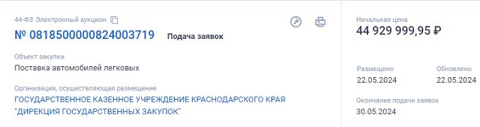 К 23 мая администрация Краснодарского края решила закупить 15 легковых автомобилей-кроссоверов. Начальная цена контракта – 44,9 миллиона рублей. На сайте госзакупок накануне днём открыли аукцион по выбору поставщика легковых автомобилей. Согласно проекту контракта, заказчиком выступает администрация Краснодарского края в лице первого замуправляющего её делами В.А. Мочалова. Планируется приобретение 15 автомобилей стоимостью 2,9 миллиона рублей каждый. Администрация готова потратить на них 44 миллиона 929 тысяч рублей. В описании объекта закупки указано, что автомобили должны быть кроссоверами на пять посадочных мест на бензиновом двигателе и с роботизированной коробкой передач. Также они обязательно должны быть оснащены системой оповещения «Эра-Глонасс». Администрации региона нужны 13 чёрных легковушек и 2 белые.