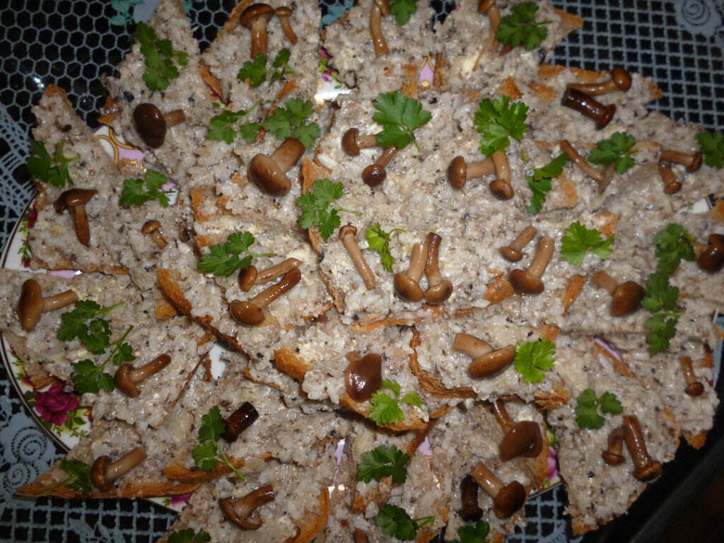 Ингредиенты: грибы белые(отваренные и замороженные)-300 г; масло сливочное-50 г; лук репчатый-1 головка; соль, специи- по вкусу; хлеб ржаной- 700 г;масло растительное-1 столовая ложка; опята маринованные, зелень петрушки- для оформления. Грибы разморозить, измельчить в блендере,посолить, добавить специи и обжарить на растительном масле. В обжаренные грибы добавить масло сливочное, измельченный лук. Все тщательно перемешать. Хлеб нарезать маленькими кусочками любой формы Сверху намазать каждый кусочек полученной грибной массой, оформить зеленью петрушки и маринованными опятами. Очень вкусно, можно использовать любые грибы. Приятного аппетита!
