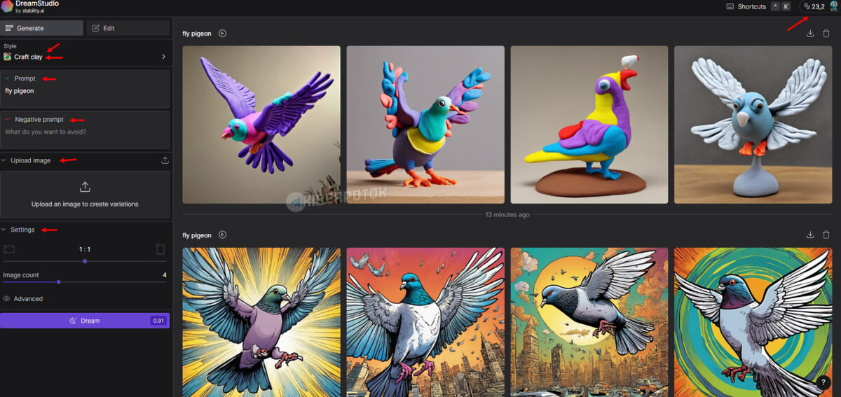 - Возможность загрузить свою картинку и сгенерировать её в определённом стиле.