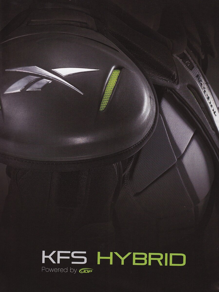 В 2012 году Reebok Hockey помимо основной линейки нагрудников представил гибридный вариант состоящий из нательной рубашки и панциря. PADDED SHIRT LONG (PS CORE) Эргономичный, нательный слой со стратегически расположенной набивкой, предназначен для интеграции с KFS Shield. Материал - Vented Mesh Polyester. Улучшенная структура ткани обеспечивает повышенное влагораспределение за счет рисунку напоминающего сетку. В составе полиэстер для легкости, износостойкости и долговечности. Ткань с добавлением полиэстера тянется, удобна в носке не мнется, быстро сохнет. Усиленная фронтальная и тыльная защита, плотно прилегающая к телу обеспечивает отличную мобильность. KomfortBase - Защита ключицы из пены с эффектом памяти обеспечивает превосходный комфорт. Grip-аппликация фиксирует налокотники на месте. KFS* HYBRID* SHOULDER PADS (SPHYBR) KFS* (Kinetic Fit System):