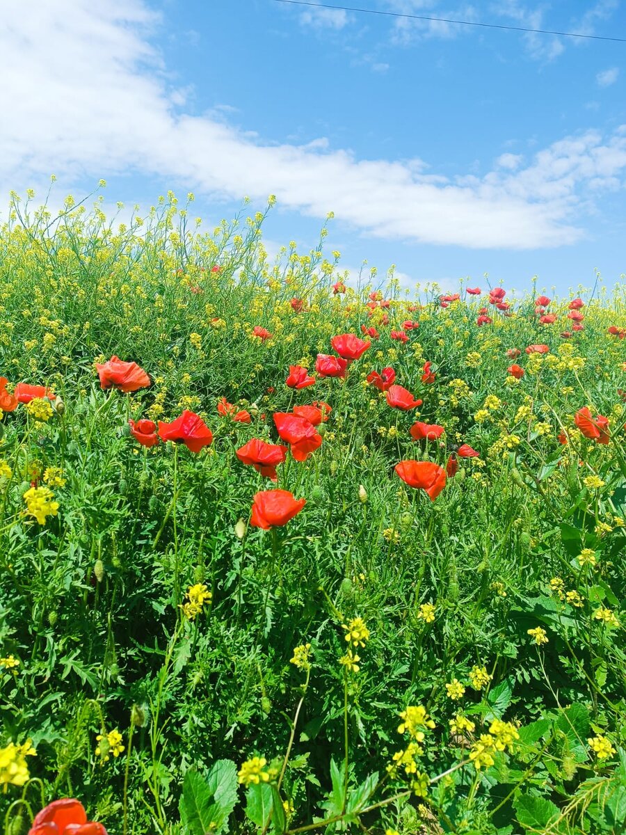 Майская степь ещё зелёная, и зелень свежая, нежная. А на зелёном яркие красные пятна. "Маки!"- вспыхнуло в мозгу. Конечно, маки, что же ещё. Хотя на скорости да ещё издалека невозможно было ничего рассмотреть подробно, сомнений даже не возникало: это маки цветут.