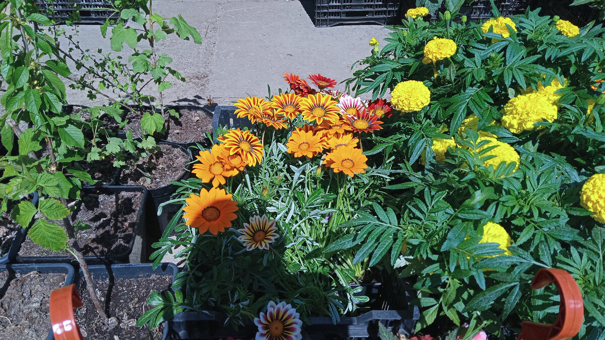 Вот две недели назад я у них (но за другими столами) видела Газанию по 100 рублей. Маленькие бутончики, но уже четко проглядывался цвет цветка. А у меня в апреле посаженные (согласно рекомендации производителя) в стаканчике две травинки тощие. Сегодня, 20 мая, эти же Газании уже полностью цветущие и те же 100 рублей. Ну за такую красоту стольника ваще не жалко. Замечательные цветные ромашки.