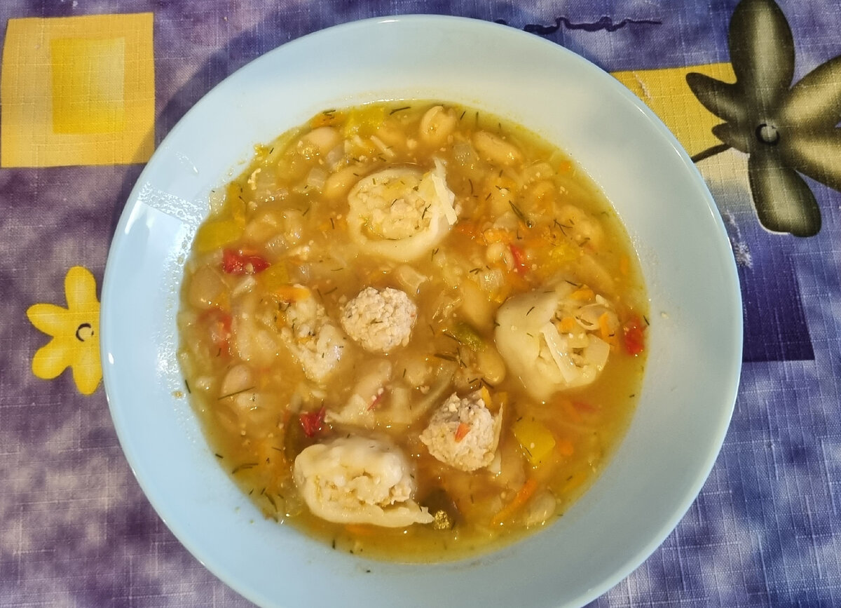 Суп с ленивыми, безглютеновыми пельменями и фасолью