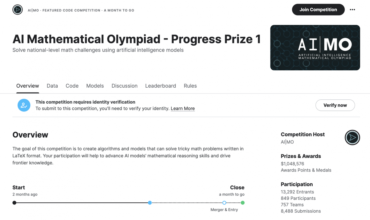 Недавно на известной площадке для ML-соревнований Kaggle был запущен конкурс AI Mathematical Olympiad. Его участники пытаются научить модели искусственного интеллекта решать задачи по математике, записанные в формате LaTeX, на уровне человека. Сложность задач соответствует уровню международной математической олимпиады для учеников старших классов International Mathematical Olympiad (IMO). Оттуда же позаимствовано и название соревнования.