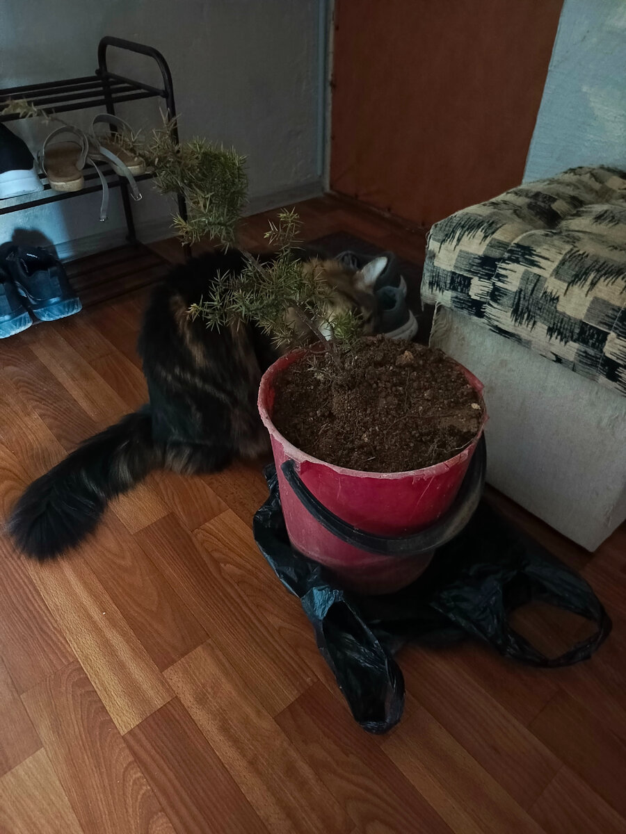Расскажу как я классно развлекался и чуть не съел новое растение. Всем привет! Очень хороший и интересный вчера день был. Утром хозяева разошлись по своим делам. А потом хозяин вернулся с таким ведром: Это можжевельник, решили посадить на улице. Конечно же я изучил внимательно это растение, все обнюхал: И конечно же попробовал на зуб, хотя мне говорили, что не надо есть его. В итоге было принято решение унести растение в палисадник иначе что-то нехорошее бы случилось: либо я его съел бы, либо погреб земельку. Хозяйка еще открыла окно на балконе чтобы что-то хозяину сказать и я ну очень хотел выйти погулять, так рвался, но не дали..... Очень расстроился. А потом хозяин решил со мной поиграть. Я много чего интересного делал, а когда пришла хозяйка с камерой, то перестал 😂 В итоге получилось несколько интересных фото. Были еще классные, но я там дергался и все размыто получилось. Тут вышел домик с головой: Кстати, домик мой починили, распрямили его. Но надолго ли😁 Тут я опять иг