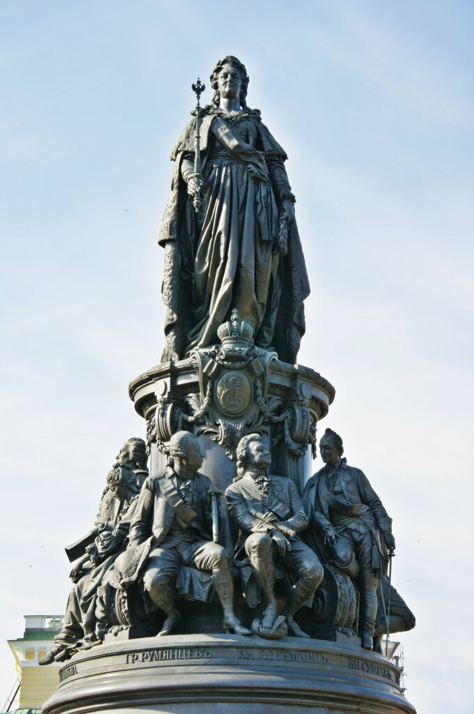 Памятник Екатерине II — это монумент, расположенный в Санкт-Петербурге на площади Островского. Он был установлен в 1873 году по приказу Александра II в честь 100-летия со дня дарования Екатериной II жалованной грамоты дворянству. Монумент выполнен из бронзы по проекту художника Михаила Микешина. Памятник представляет собой величественную фигуру императрицы, которая держит в руках символы власти — скипетр и державу, у ног Екатерины II лежит корона Российской империи. Вокруг пьедестала расположены фигуры видных деятелей екатерининской эпохи: государственных деятелей, полководцев, выдающихся людей своего времени. Среди них — поэт Державин, генералиссимус Суворов, князь Потёмкин и другие. Интересные факты о памятнике Екатерине II в Санкт-Петербурге: В советское время отношение к памятникам царской эпохи было неоднозначным. Некоторые из них были уничтожены или перенесены в другие места. Однако памятник Екатерине II чудом избежал этой участи. Существует легенда, что памятник спасли от уничт