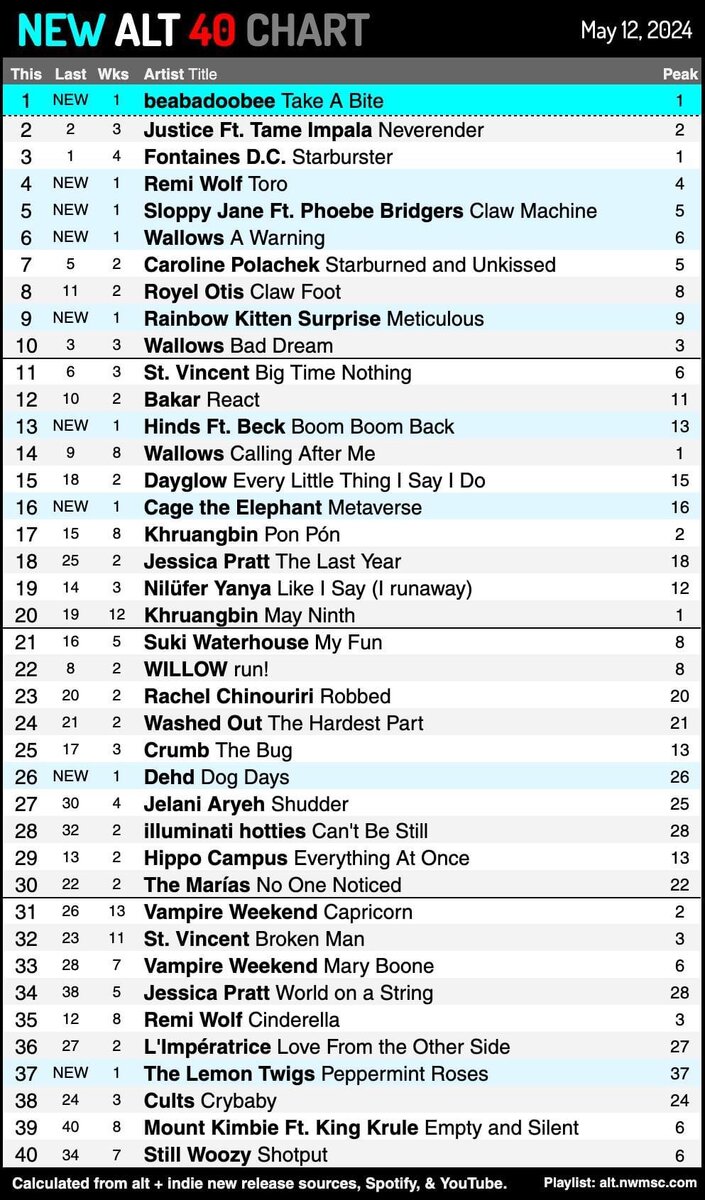 REMI WOLF, SLOPPY JANE FT. PHOEBE BRIDGERS, WALLOWS, RAINBOW KITTEN SURPRISE, HINDS FT. BECK, и CAGE THE ELEPHANT также дебютируют своими синглами в ТОП-20.