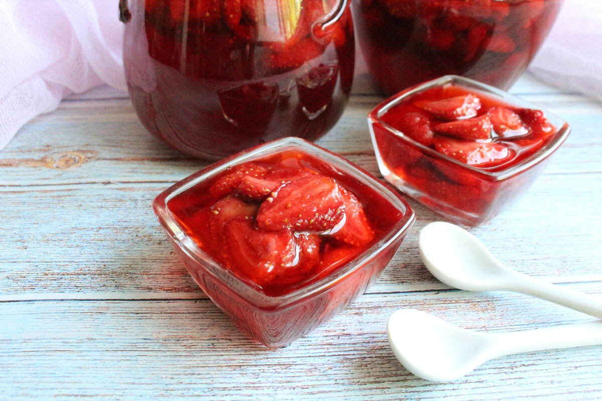 У нас уже вовсю идет сезон клубники и можно делать вкусные заготовки на зиму. Это один из самых простых рецептов заготовки клубники, легче ее только заморозить. Клубника получается невероятно ароматная, яркая, вкусная в большом количестве сладкого сока. Хранить эту заготовку желательно в холодильнике. Да, занимает место, но я заготавливаю клубнику разными способами, поэтому хоть пару баночек такой клубники можно сделать и спрятать в самый низ холодильника. Если клубника сочная, то из этого количества ингредиентов получится две литровые баночки. Ингредиенты: Клубника - 1 кг. Сахар - 800 г. Клубнику почистим от веточек, промоем ягоды. Крупную клубнику разрежем в длину на четыре части, а если ягоды мелкие, то разрежем их на две половинки. Выкладываем ягоды в чашку, добавляем сахар и оставляем так чашку при комнатной температуре на ночь. Через некоторое время ягоды дадут сок, надо начинать их перемешивать, чтобы сахар растворился. Таким образом клубнику перемешиваем каждые 2-3 часа. Сахара