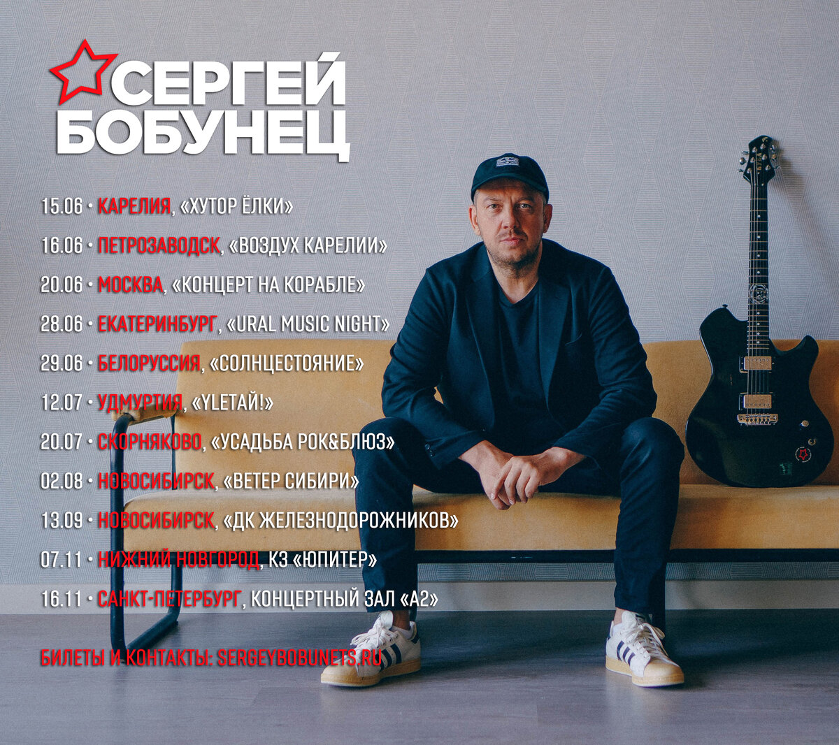 15.06 • КАРЕЛИЯ, ПОСЁЛОК РУСКЕАЛА, «ХУТОР ЁЛКИ» 16.06 • ПЕТРОЗАВОДСК, ФЕСТИВАЛЬ «ВОЗДУХ КАРЕЛИИ» 20.06 • МОСКВА, «КОНЦЕРТ НА КОРОБЛЕ» 28.06 • ЕКАТЕРИНБУРГ, «URAL MUSIC NIGHT» 12.07 • УДМУРТИЯ, ФЕСТИВАЛЬ «YLETAЙ!» 20.07 • СКОРНЯКОВО, ФЕСТИВАЛЬ «УСАДЬБА РОК&БЛЮЗ» 02.08 • НОВОСИБИРСК, ФЕСТИВАЛЬ «ВЕТЕР СИБИРИ» 13.09 • НОВОСИБИРСК, «ДК ЖЕЛЕЗНОДОРОЖНИКОВ» 07.11 • НИЖНИЙ НОВГОРОД, КЗ «ЮПИТЕР» 16.11 • САНКТ-ПЕТЕРБУРГ, КОНЦЕРТНЫЙ ЗАЛ «А2» БИЛЕТЫ И КОНТАКТЫ: SERGEYBOBUNETS.RU