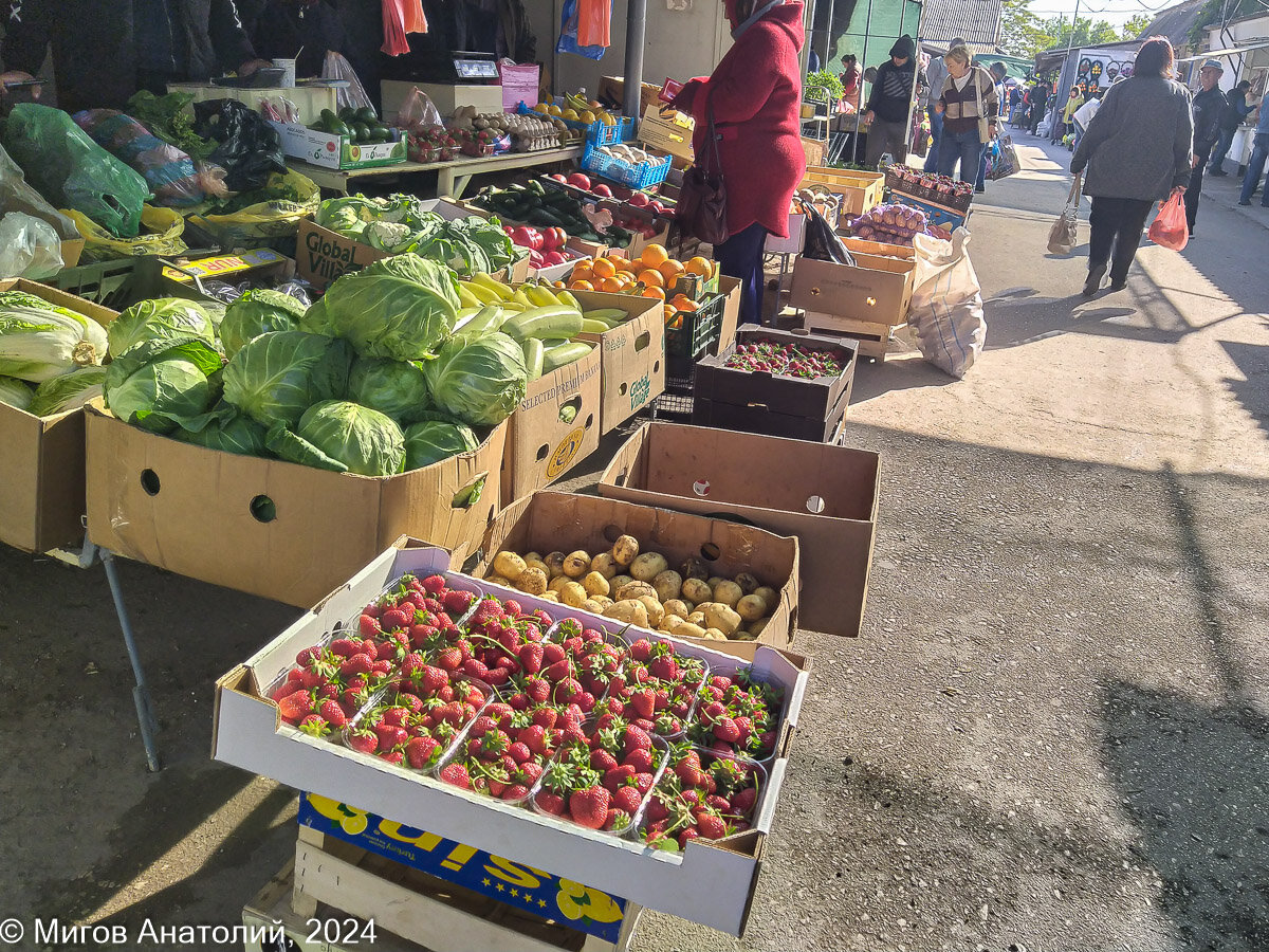 Пришёл на рынок в 7.55, он только начал разогреваться, людей мало, выбора много. У меня было две главные задачи - клубника и домашняя курочка. Всё остальное, что я обычно беру по воскресеньям на нашем Старокрымском рынке, я купил в субботу. Сегодня совсем не собирался, однако обнаружилось, что 2 кг клубники, купленных вчера, мы с Леной съели. Мелкая была, но сладкая, почти как настоящая летняя грунтовая. Так что я решил повторить. Клубники на рынке много. И на развес, и уже расфасованная в лотки. Самая популярная цена - 180 руб/кг. Но есть и по 170, и даже видел в одном месте по 150 рублей. Одна беда - кислая. Солнца в последние несколько дней у нас было мало, вот клубника и не набрала сладости. А той, сладкой, что брал в субботу, уже не было, ещё вчера всю распродали, а новая пока не созрела. Обошёл весь рынок, у всех попробовал. И в одном месте, на рыночной площади, где торговля только по воскресеньям, нашел то, что мне нужно. Здесь была самая высокая цена на сегодняшнем рынке, но за