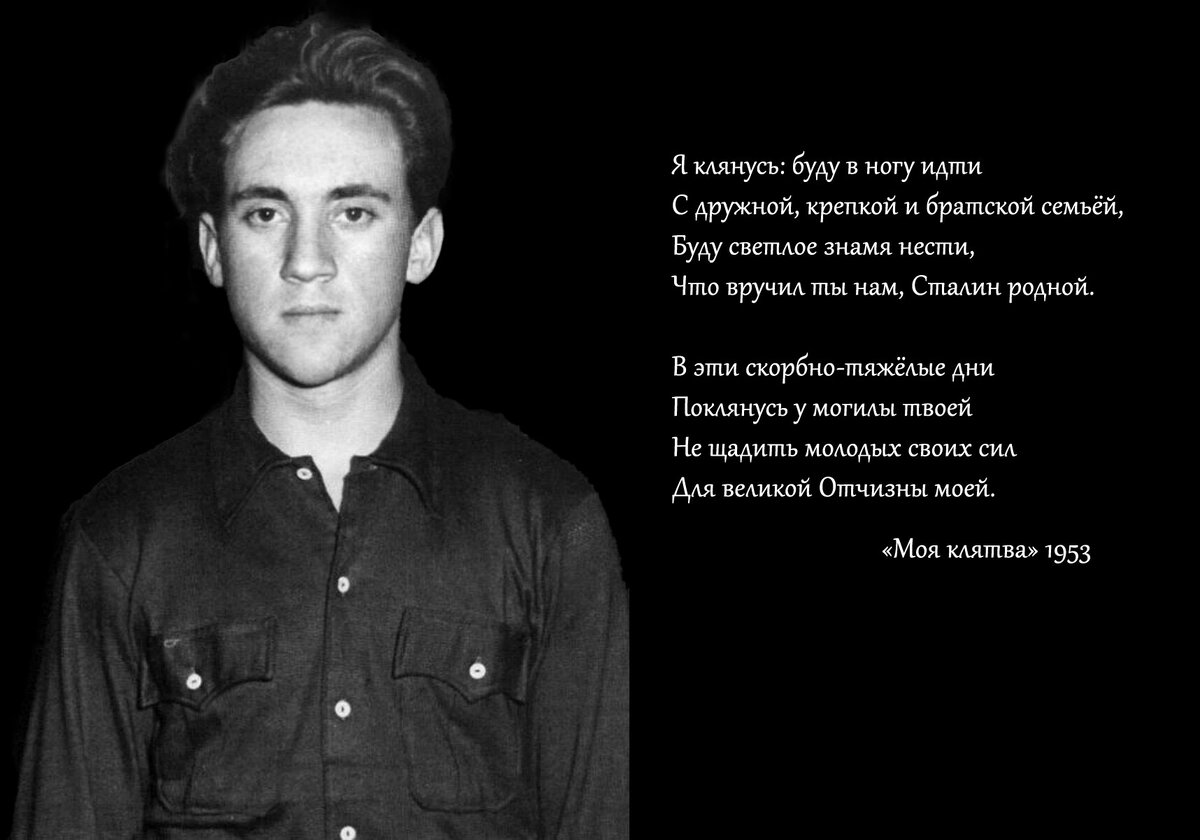 Не совсем взрослый, но уже не мальчик, он переживал вместе со всей страной смерть такого человека по-своему. О том, что есть конъюнктура, лицемерие и фальшь, в то время Володя еще не знал. Стихи писал искренние, хотя и по юношески, наивно. Главное, в чем он клялся – это была любовь к Родине, дружной братской семье народов. И остался верен этой клятве до конца. Так что плохого в этой клятве? И что в ней неправильного?