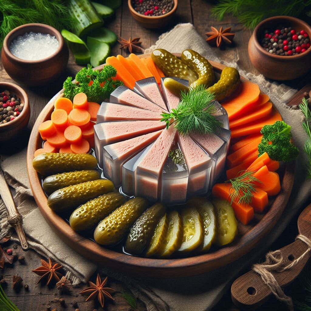 Холодец – это классическое русское блюдо, известное также как кулебяка, зельц или мясной желе. Оно готовится из мясного бульона, который застывает в холодильнике, образуя твердую желеподобную массу, в которой распределены кусочки мяса. Холодец часто подается в холодном виде как закуска, особенно популярен в летний период. Ингредиенты: Инструкции: Холодец обычно подается со сливочным маслом, горчицей, зеленью или кислыми маринованными овощами