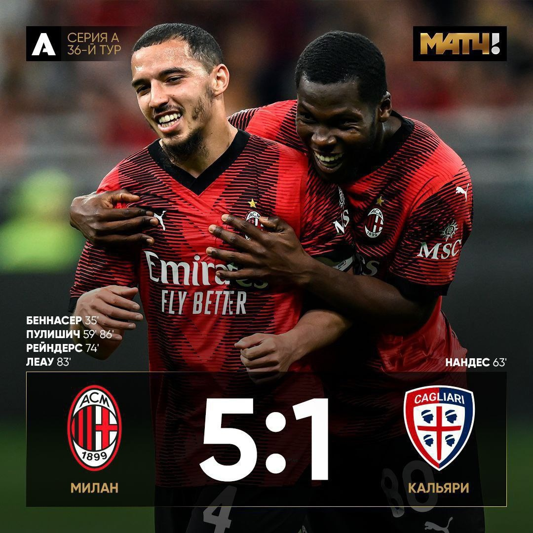 Милан на своем поле с крупным счетом обыграл Кальяри в 36-м туре Серии А — 5:1.