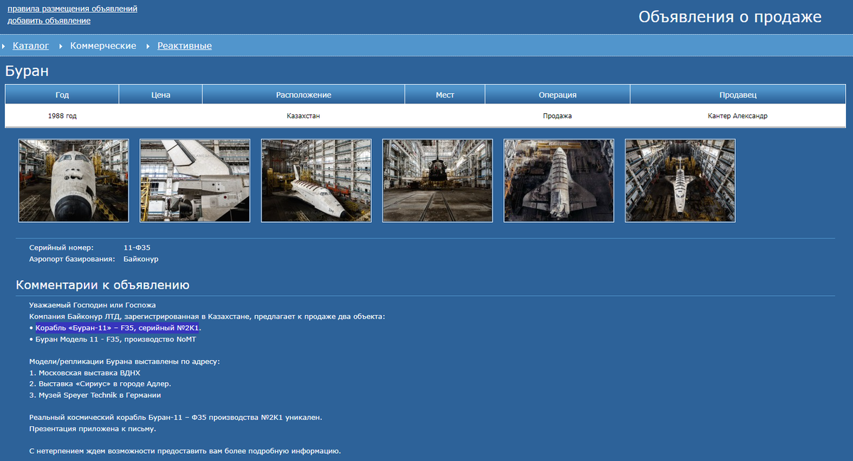 Здравствуйте, дорогие друзья! Сегодня я хочу поговорить с вами о том, что вызвало у меня очень негативную реакцию, хотя, если честно, меня сложно чем-то удивить. Блуждая по иногда замысловатым коридорам Сети, я неожиданно наткнулся на вот это: Шрифт на картинке мелковат, и я напишу буквами. На этой страничке предлагают к покупке… барабанная дробь… космический корабль «Буран-11» – F35, серийный №2. Продаёт его некий гражданин я так, понимаю, Казахстана, цена не указана. Да, я понимаю, что этот экземпляр давно ржавеет в одном из заброшенных корпусов космодрома Байконур. И что рано или поздно с ним нужно что-то было делать. И что при разделе советского наследия кто-то кому-то что-то там уступил, казахи забрали себе всё, что осталось от программы «Энергия-Буран», благополучно «забили» на все эти ненужные железки, ибо их предназначение так и осталось загадкой. А потом и вовсе продали за копейки всё это добро частным лицам по цене металлолома. Но мы то с вами знаем, что это за «металлоло