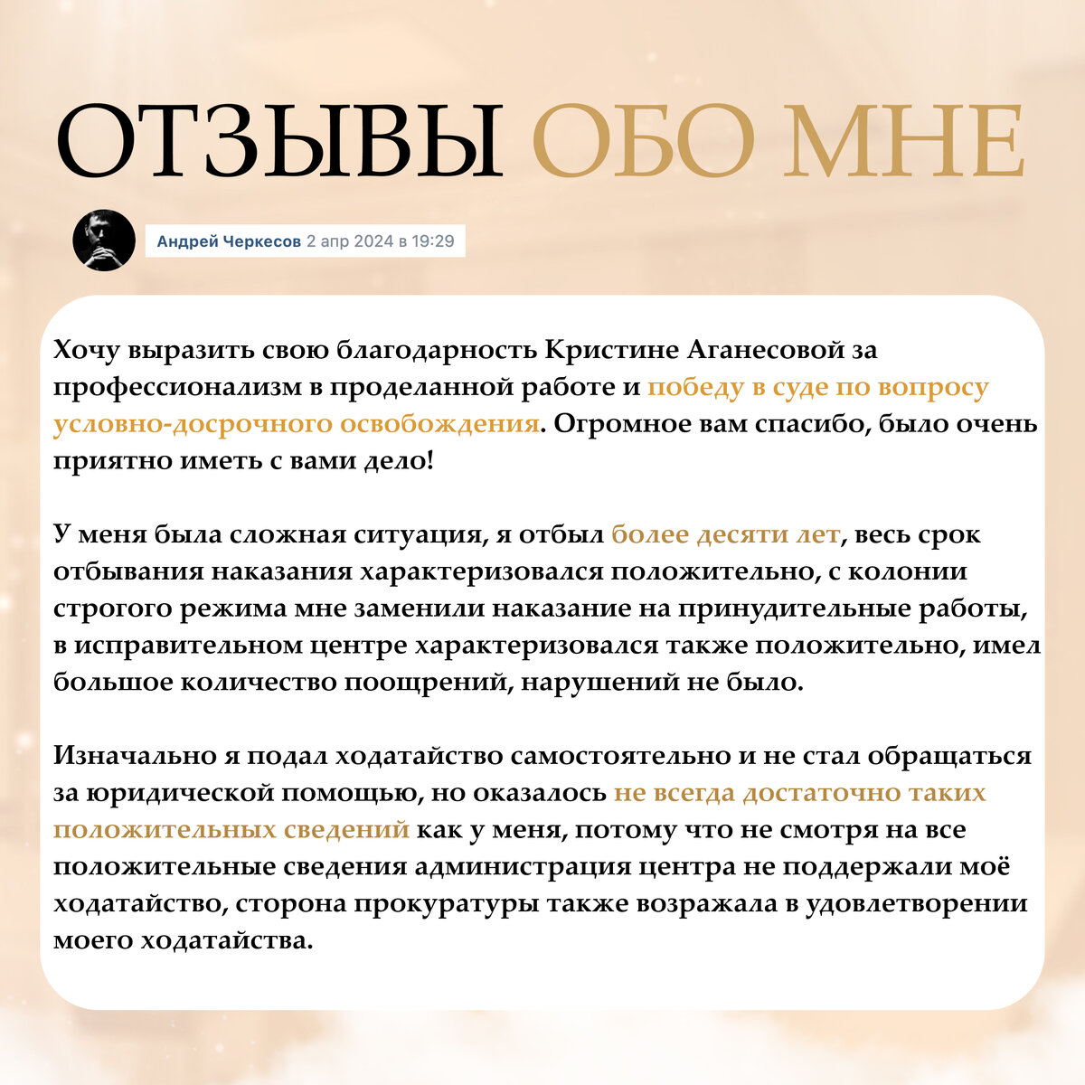 Мы выиграли дело по УДО, когда прокурор и колония были против. Мы доказали, что наш подзащитный, осужденный по ст. 228 УК РФ, имеет полное право на выход по УДО и судья поддержал наше ходатайство! Отзыв получился чуть больше, чем мы ожидали, поэтому он будет размещен на нескольких фотографиях. Обратная связь всегда очень важна и приятна, ведь по ней можно понять, что мы работаем не зря! Спасибо за доверие🤝🏼 ______________ Будьте свободны! 🤝🏻 Если вам нужна консультация, юридическая помощь или защита в суде, обращайтесь по контактам ниже 📲 +7 918 439-23-76 (ВотсАп / Телеграм) Написать мне в ВК: Написать мне в Телеграм: https://t.me/aganesova_advocate Написать мне в WhatsApp: https://wa.me/79184392376 аписать мне в WhatsApp: https://wa.me/79184392376 ДРУГИЕ МОИ ПУБЛИКАЦИИ