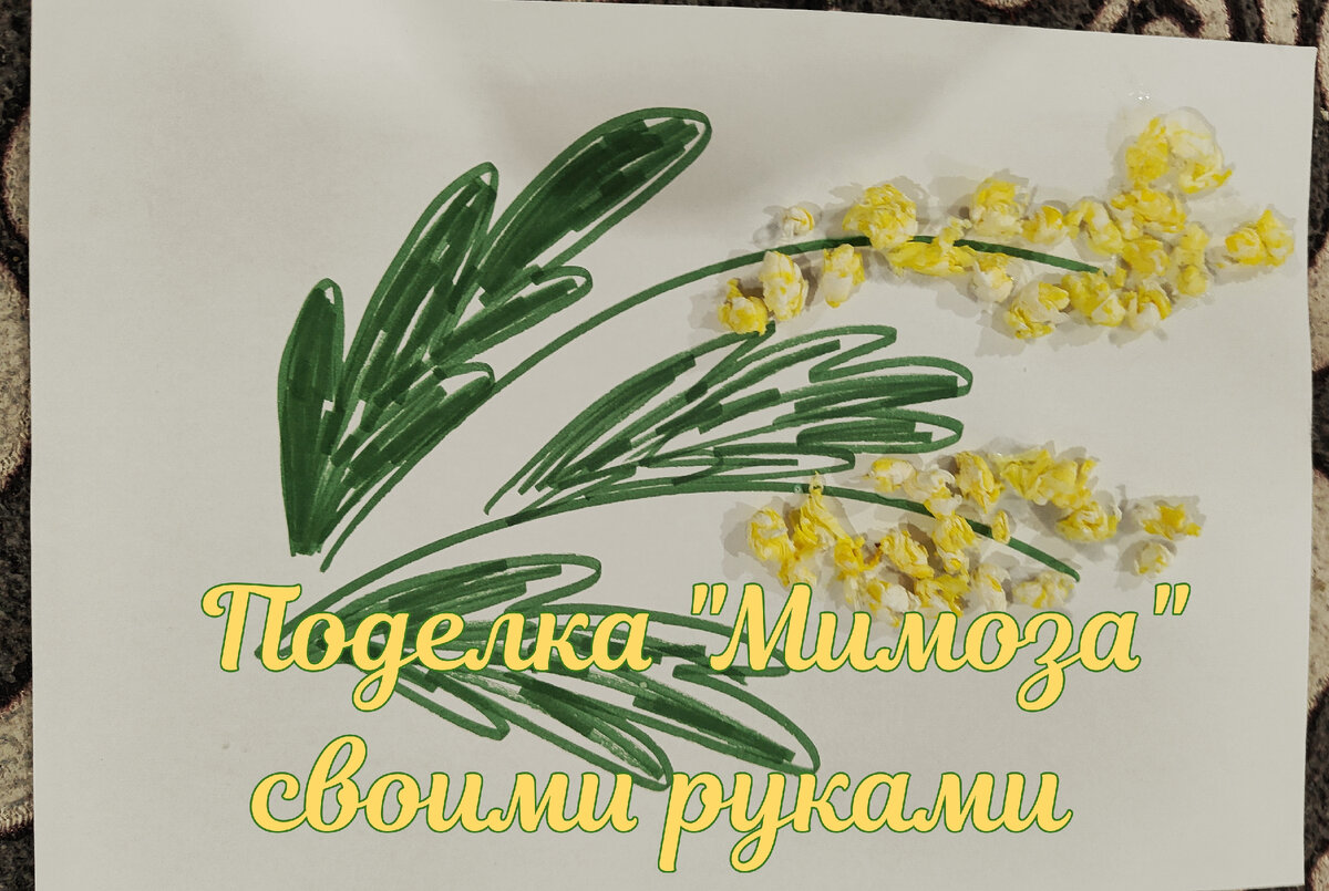 Добрый день, дорогие друзья! Сегодня делали с ребенком очень простую и легкую поделку. Отлично такая аппликация подходит к 8 Марта - открытка с мимозой своими руками. Хорошо развивает мелкую моторику. Прекрасный вариант для занятий творчеством с Вашим малышом. Список необходимого: Начинаем делать поделку: На картоне или листке бумаги рисуем веточку и листья для цветка. Можно сделать из цветной бумаги. Бумажные салфетки раскрашиваем с помощью фломастеров, красок или карандашей в желтый цвет (под цвет мимозы). Если у Вас уже желтые салфетки - отлично! Далее рвем салфетки на мелкие кусочки. Скатываем кусочки в небольшие комочки. С помощью клея наклеиваем комочки к веточке. Замечательных Вам поделок, отличного настроения!