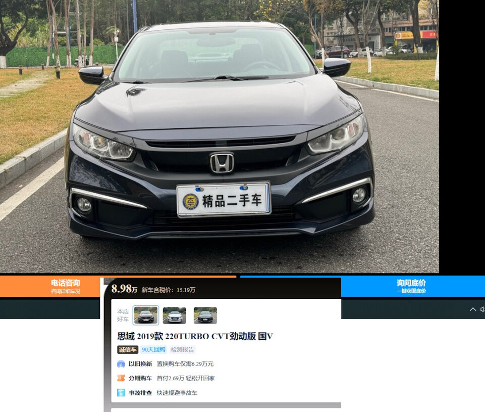 Так вот, параметры следующие: год не старше 2017, пробег до 100 тыс км, полный привод, ну это если повезет. Фавориты были УАЗ Патриот с акпп и Камри 3.5, параллельно поглядывал на всякие машины в Беларуси, по китайскому сайту шерстил, там есть варианты купить и доставить Тойоту Короллу на моторе 1.2 за цену 1.6-1.8 млн рублей уже в Москве под ключ. Год будет от 2019 и пробег до 60-70 тыс км, прямо хороший вариант. Потом переключился на китайские Хонды. Вот эту черную можно купить и доставить в из Китая в Москву за 2.2 млн рублей примерно по курсу юаней начало мая 2024. Сивик будет интереснее короллы, шустрее, так как 177 сил, а в Королле 112.