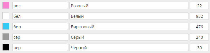 Всего: (роз) x 22, (бел) x 832, (бир) x 476, (сер) x 240, (чер) x 30