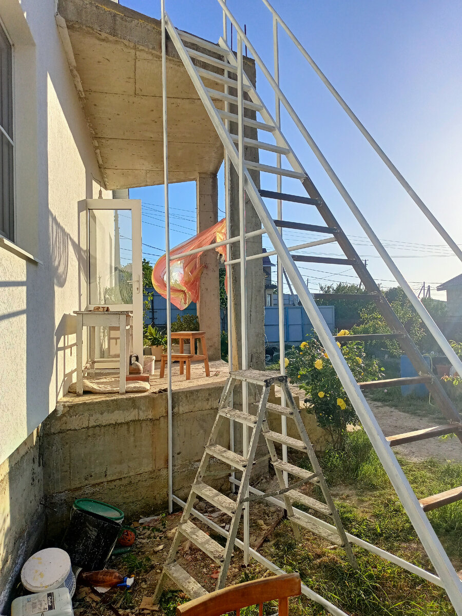 Вы видели, как детеныш обезьяны держится за мамку, когда она прыгает с ветки на ветку? Если не видели, то я вам скажу - очень крепко! Вот примерно так я сегодня держалась за лестницу, когда красила ее со всех сторон на высоте шести метров. А надо вам признаться, к старости я стала бояться высоты. Не столько прям вот высоты, сколько свалиться с нее. Поэтому держалась я изо всех сил! Сначала банку с краской я ставила на ступеньку. Но ступенька в три раза уже банки. И если я банку уроню, то будет жалко 680 рублей. Ну, минус то, что уже успела покрасить. Поэтому, припомнив ТРИЗ (теория решения изобретательских задач Генриха Сауловича Альтшуллера), поставила банку в ведро, согнула из тонкой арматуры двойной крючок и вешала это всё на ступеньки. Одна рука освободилась для того, чтобы цепляться ей за жизнь. Дело пошло веселей. Но все равно устала я так, что каждая мышца болит. Но лестницу я не докрасила. В детстве стишок был у меня любимый Михалкова: Я карандаш с бумагой взял, Нарисовал