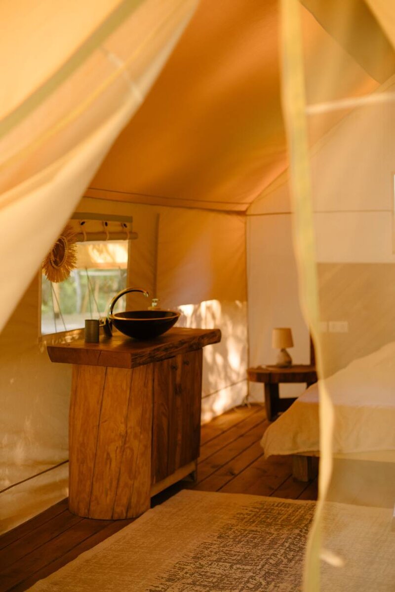 Отдых на природе, но без авантюр в виде спальника, отсыревшей одежды и туалета в ельнике называется глэмпинг. Это комфортное, гламурное дикарство. Палатка — добротная, с деревянным полом. Кровать — полноценная, с постельным бельем. Даже сеть ловит на все палки, но пользоваться ею некомильфо — весь смысл в том, чтобы почувствовать себя в моменте и в ресурсе. 🏕️Глэмпинг «Горный енот» находится в 23 км от Геленджика, на горе, в дубовой роще, на краю пустующего СНТ. 🏕️ Добраться можно на собственной машине (есть грунтовый участок дороги), такси или оплатить трансфер. 🏕️ Весь глэмпинг — это два шатра для гостей и вдалеке — дом хозяев. Есть баня, купель, костровая зона, мангал, беседка, батут для детей. Аренда шатра — от 5000 руб./сутки, баня и купель оплачиваются отдельно. 🏕️В 10-15 минутах ходьбы через лес — озеро Церковное: можно потренироваться на сапе, ловить рыбу или просто созерцать. В глэмпинге можно заказать двухчасовую конную прогулку по лесу или отправиться в пешее путе
