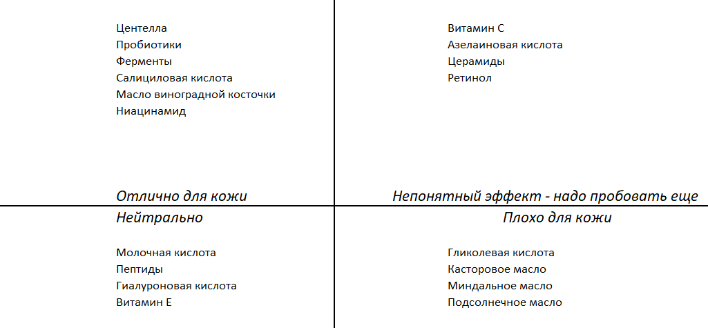 Я люблю свою кожу, потому что другой у меня все равно не будет. 😅 При этом постоянно экспериментирую. Вдруг где-то в недрах российского косметического мира притаился крем, который сделает мое лицо идеальным? Осталось всего лишь найти его. У меня есть план - попробовать все активные ингредиенты (не одновременно, а постепенно), чтобы понять как моя кожа реагирует на каждый из них. Ведь пока не попробуешь сам - можно ли открыто заявлять, что какое-то средство хорошее, а какое-то плохое? И вот моя табличка, которую удалось сформировать за 3.5 года бьюти-деятельности, и она конкретно про мою кожу: Моя кожа: комбинированная, нос и лоб более жирные, щеки всегда сухие. Зимой кожа в целом ближе к сухой, летом Т-зона ближе к жирной. Мне 35 лет, уже есть морщинки под глазами, пигментные пятнышки на щеках (в детстве каждое лето я проводила в деревне у бабушки, это по 3 месяца на свежем воздухе 24/7 - привет, пигментные пятна в 14 лет). Кожа реактивная, если что-то не так - моментально появляются