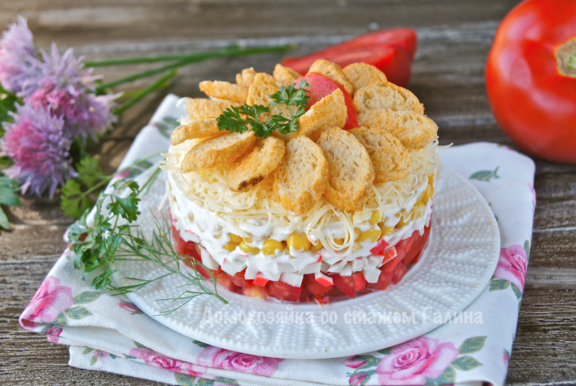 Здравствуйте, дорогие читатели! Хочу поделиться с вами рецептом вкусного салата из крабовых палочек, который станет ярким украшением праздничного стола. Начнем с того, что продукты необходимо выкладывать слоями, чтобы избежать лишней жидкости. Таким образом, салат останется красивым и аппетитным до момента подачи к столу. Не советую смешивать томаты напрямую с другими продуктами, чтобы избежать размокания салата. Главное – последовательность и аккуратность при нарезке и выкладывании слоев. Придерживаясь этих простых правил, вы гарантированно порадуете себя и гостей великолепным блюдом. Еще, салат хорош тем, что ничего варить для него не нужно. Первым делом подготовьте все необходимые продукты Состав: