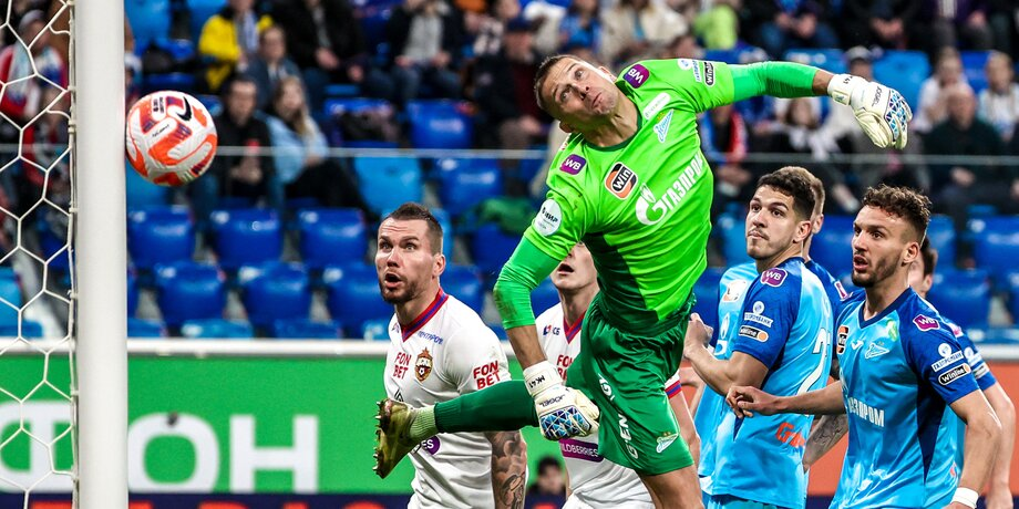 В начале статьи я приводил фото, где показывал высокую линию обороны ЦСКА. Но и она возможно лишь тогда, когда вратарь уверенно действует на выходах и ЦЗ знает, что заброс ему за спину, станет легкой добычей голкипера.