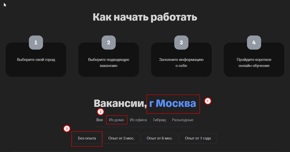 2) Выбираем свой город (1), выбираем "Из дома" (2) и "Без опыта" (3)