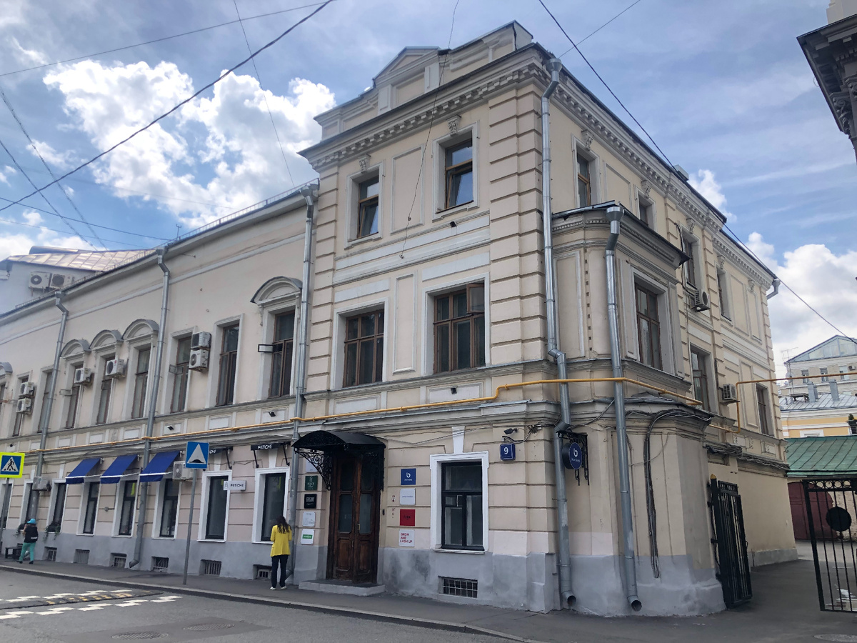 Этот небольшой особняк неподалёку от Арбата внешне ничем не примечателен. Обычный московский дом, таких много: Фасады, выходящие во двор, ещё скромнее и проще: Но на самом деле это не так. Потому что интерьеры этого особняка удивительны, уникальны. Небольшой усадебный дом в классическом стиле был отстроен после великого московского пожара надворным советником Николем Николаевичем Гардеевым в 1820. Затем разные владельцы несколько раз перестраивали здание: был демонтирован портик с фронтоном, центральная часть фасада оформлена тремя полукруглыми оконными проёмами: Был пристроен эркер: В результате в 1850-х дом получил свой нынешний облик: Внутри - масса всяческих магазинчиков и даже небольшая гостиница. Поэтому сюда свободно можно зайти. Давайте так и сделаем. Открыв двери, оказываемся на распутье: налево - на первом этаже - магазины: А мы проходим прямо, поднимаемся по парадной беломраморной лестнице: На втором этаже - бизнес-центр, офисы: В особняке сохранились витражные окна, мас
