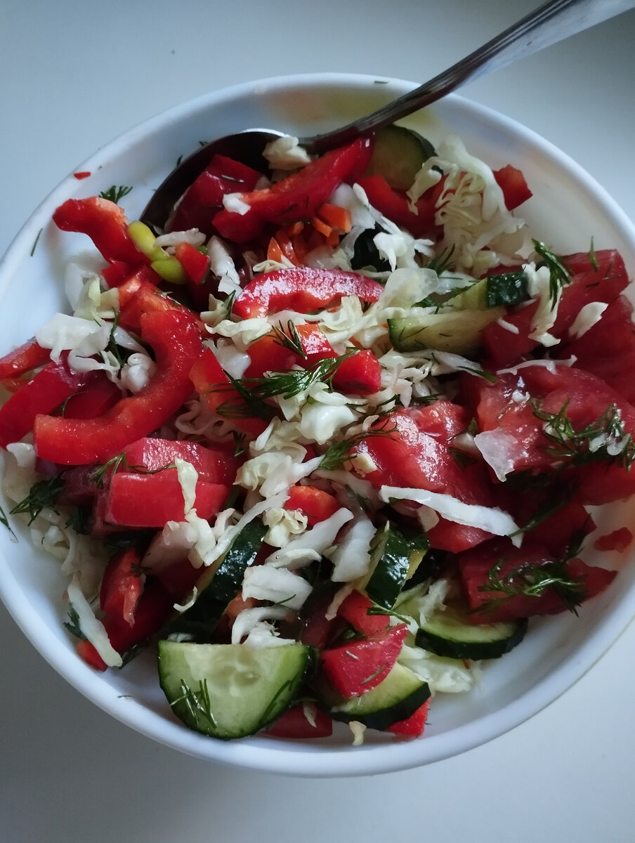 Весной я люблю готовить именно такой очень витаминный салат из свежих овощей. В первую очередь его основой становится молодая капуста, которая на рынке появляется уже в апреле. К ней добавляю немного огурцов, когда они ещё дорогие. А сейчас в первой половине мая цены уже приемлемые, потому можно по-настоящему витаминизироваться, при этом зная один маленький секрет покупок на рынке. Но сначала расскажу, что было в этом салате, приготовленном на ужин: капуста, огурцы, сладкий перец, помидоры, морковь и укроп. Капуста на рынке уже давно по 65 рублей. Огурцы сегодня продавали по 80, но одна из продавщиц выложила несколько штук по 60, потому что немного завяли. Их нужно было только хорошо помыть и положить в холодильник. Там они вновь стали хрустящими. В другом месте завяли крупные сладкие перцы. Свежие продают по 250 рублей, а эти можно было купить всего по 150. С помидорами случилась иная проблема. Крупные вкусные стоят 300 рублей, но из-за мелких повреждений цену снизили до 100. Для с