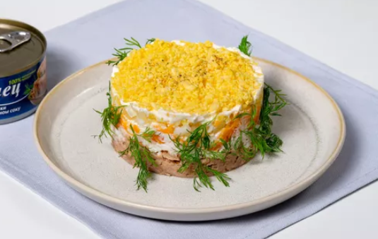 Чтобы салат получился нежным и воздушным, измельчайте все ингредиенты на мелкой терке и выкладывайте в салатницу, не прижимая и не придавливая. Подайте «Мимозу» в прозрачном салатнике, чтобы были видны красивые и аппетитные слои. А если такого нет, то возьмите разъемную форму и просто снимите ее перед подачей. Для нижнего слоя понадобится тунец в собственном соку. Достаточно размять рыбу вилкой, больше с ней ничего делать не нужно. Можете взять тунца в масле или другие рыбные консервы. Только убедитесь, что в рыбе нет косточек. Приготовление: