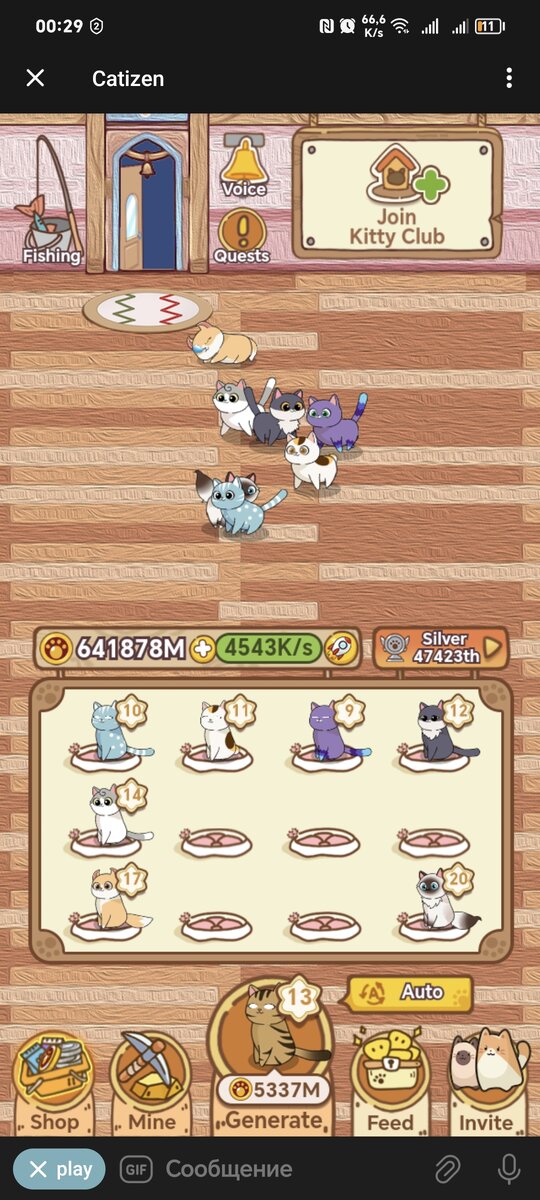 [ - новый гем последнего месяца весны. Игровой процесс напоминает надевние NOT и HOT, только напорядок интереснее. Это самый настоящий фарминг котиков, где мы должны, в роли, видимо, хозяина котокафе, по принципу игры 2048 объединять котиков и получать нового котика, более высокого уровня, который будет приносить больший доход, чем предыдущие. Проект, с момента начала ОБТ (19.03.2024) , уже собрал огромное комьюнити в почти 5,000,000 пользователей, и продолжает расти ежедневно, поэтому самое время нам в него заходить - В игре есть 2 вида монеток: Золотые $vKitty, они зарабатываются с помощью котиков, чем прокаченнее котик, тем больше он приносит $vKitty. За эту валюту можно купить новых котиков, чтобы скрестить их и получить кота уровнем выше. Для этого нужно кликнуть на иконку Feed - откроется Cat Shop - тут и покупаем котов. Купленный котик приземлится в пустую ячейку - далее его можно скрещивать, если есть другие коты его уровня. Серебряные $Fish. За них можно гонять на рыбал