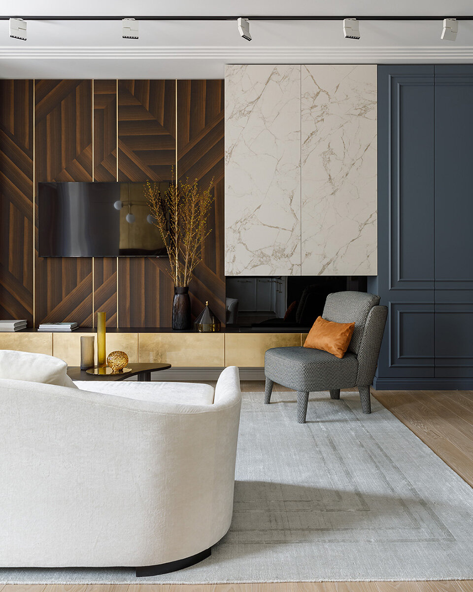 Интерьер гостиной в квартире, расположенной в ЖК «Дом с Мансардой» на Большой Зелениной улице. В зоне телевизора мы установили стеновые панели в отделке натуральным шпоном, выполненные по индивидуальному проекту. При этом шпон уложен в определённой композиции, которая дополняется вертикальными латунными профилями. В нижней части расположена подвесная тумба с фасадами в отделке золотой поталью. Конфигурацию внутреннего пространства тумбы мы продумывали так, чтобы можно было скрытно разместить всё мультимедийное оборудование, и провода не бросались в глаза. Одним из акцентов этой композиции является интегрированный в тумбу биокамин, над которым мы разместили систему хранения с фасадами, выполненными из керамики с имитацией мрамора. Эту мебельную композицию мы изготовили по проекту дизайнера Ольги Гусевой. . . . Архитектоника - комплектация интерьеров