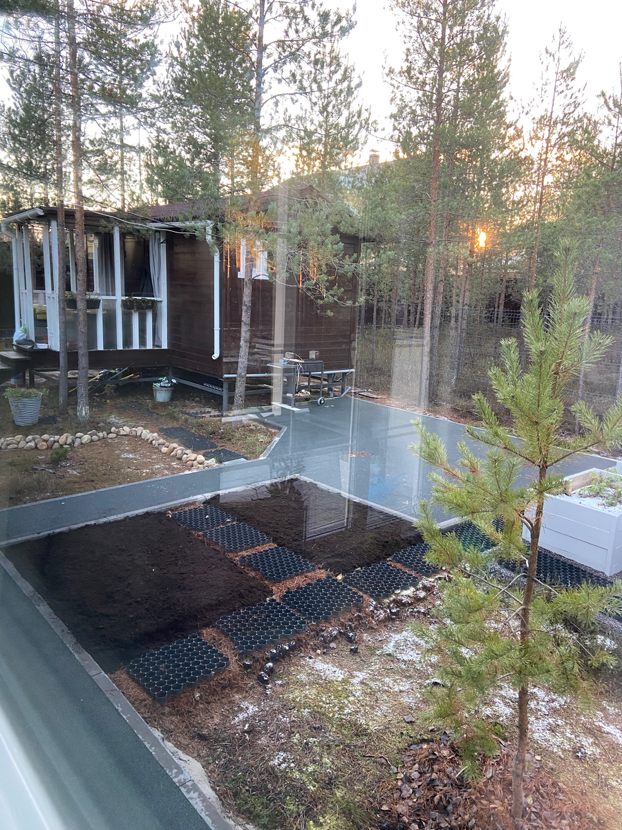 В прошлом году зима наступила как-то быстро, и все работы, запланированные на прохладный ноябрь, накрылись медным тазом. Вернее, первым снегом.:) Поэтому нам пришлось в экстренном порядке прикрывать только что сделанные дорожки вокруг наших новых грядок сосновым опадом. Его было очень много, как никогда, и я решила, что это хороший способ сохранить эти дорожки сухими. Вот так они выглядели перед зимой: Кстати, посыпка мягких (из плотного торфа) дорожек сосновым опадом - плохая идея, так как ходить по нему, даже если сверху пластиковые решетки, очень сложно - всё под тобой шатается. Короче, в качестве постоянного покрытия очень не советую. Долгими зимними днями я периодически смотрела на нашу "огородную" зону и что-то мне в ней не нравилось. Потом я поняла: мне не нравилось, что она не выглядит как отдельная зона! А с учётом появившейся прямоугольной "грядки" для смородины (справа) пространство кажется каким-то незавершённым. И что? А то, что надо его завершить.:) И потому с приходом