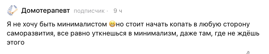 На днях я записала короткий ролик о том, что популярность минимализма – закономерный ответ на запросы общества потребления: И под ним комментатор оставил потрясающий комментари: Именно об этом я и хочу сегодня поговорить. В минимализме всё связано со всем. И сам он тоже связан со всем. И в какую сторону ни пойдёшь развиваться – в него упрёшься. Но начинается всё с того, что однажды...⤵️ Первые разы – безуспешно. Через какое-то время понимаешь, что будешь бесконечно танцевать вокруг своего хлама, пока не начнёшь ПОТРЕБЛЯТЬ иначе. И поэтому...⤵️ Покупаешь вещи реже, а сами они становятся качественнее. Средний чек растёт, а количество транзакций – падает. Процент трат на товары снижается в пользу услуг. Считаешь всякие там проценты, откладываешь, инвестируешь. Заводишь таблички, ведёшь. Начинаешь копить на важные покупки, которые давно откладывал. На мечты, в которые уже почти перестал верить. На этом этапе с минимаистом случаются путешествия. Впервые на 100% пролеченные зубы) Классные о