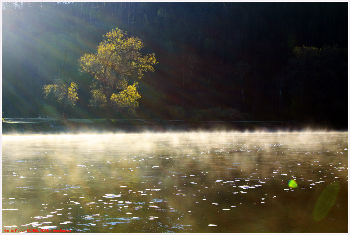 По привычке встал в шесть утра в башкирской деревеньке Миндигулово и пошёл вдоль берега реки Белая. По башкирски – Агидель. Шёл навстречу солнцу по лугу, на котором выпал иней. И это 11 мая! А дальше, как во сне: в контровом свете восхода на зелёных листочках иней переливался яркими самоцветами. Но почему-то только фиолетовыми и золотистыми оттенками. Я словно очарованный небесный странник плыл по этой лазурно-золотистой тропе на свидание с красивой и капризной Агидель.
