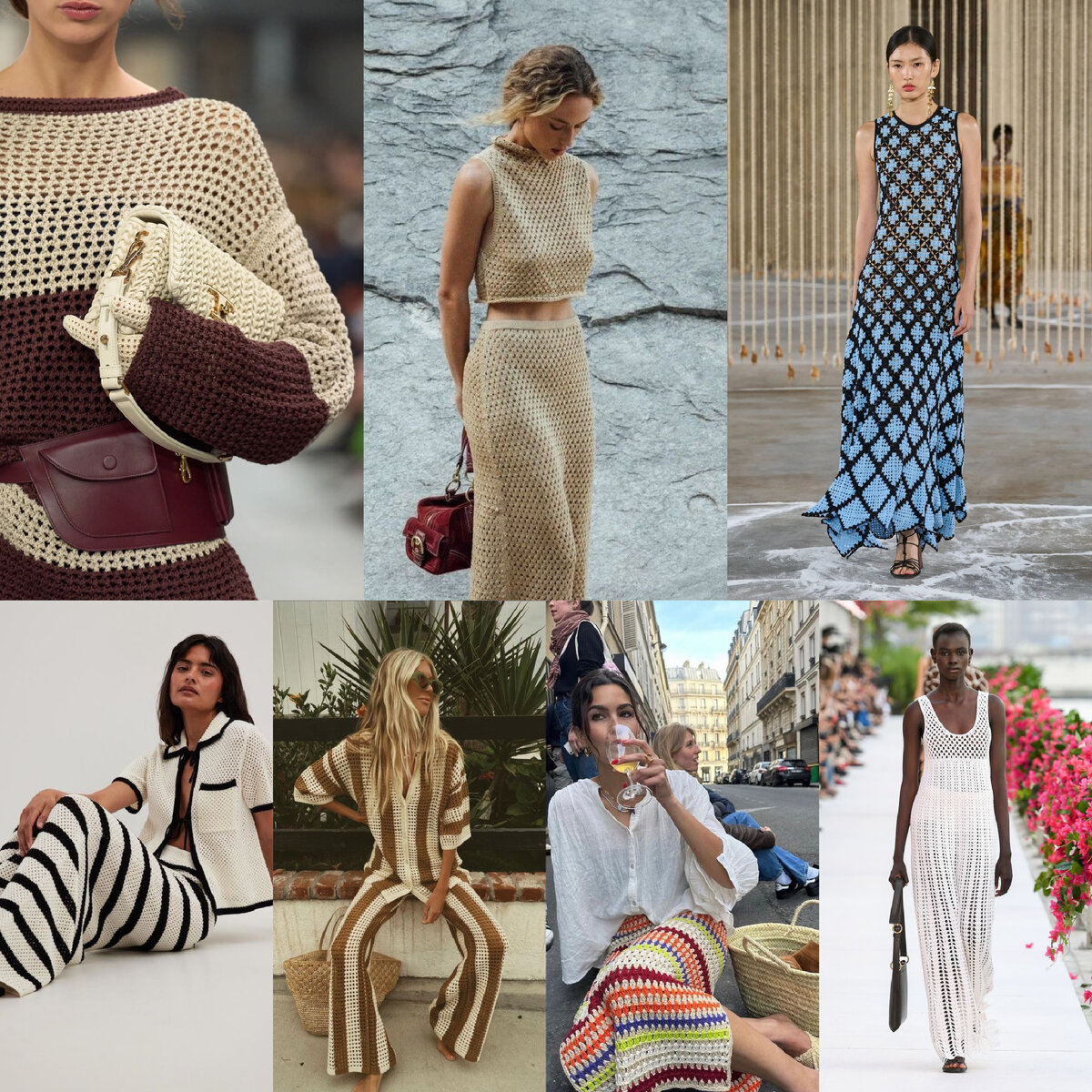 Приветствую Вас, стильные леди! Кроше для меня всегда про лето и имеет стойкую ассоциацию с культурой хиппи. Легкость, невесомость и экологичность. Кроше (франц. «crochet») переводится как «маленький крючок». В индустрии моды под кроше понимают вещи, связанные крючком, имеющие большие сквозные дыры и ажурные переплетения. Первые появления этой техники можно увидеть в XIX веке в основном в элементах декора (скатерти, салфетки и пр.). Одежда в технике кроше стала особенно популярна в 70-е. Именно хиппи привили любовь к натуральным материалам и подобным вещам. В 2023/24 тренд на кроше плотно вошел на подиуме и как результат хлынул в коллекции брендов. Мне тренд очень нравится, одежда в этой технике прекрасно сочетается с городом и пляжным отдыхом. Как носить в городе?! Используйте аксессуары в этой технике, например, возьмите сумочку, она прекрасно разбавить летний костюм из льна или тонкого хлопка. Или будет частью кэжуал образа, дополнив джинсы и рубашку. Если говорить про вещи (плать