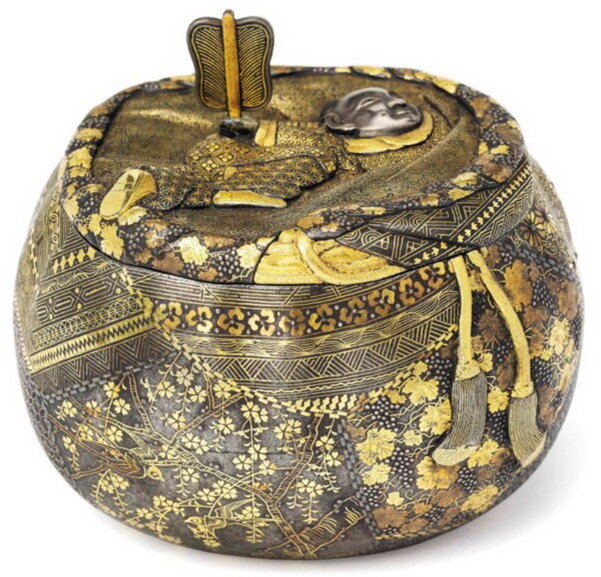 Железный сосуд с крышкой с изображением петуха и курочки, инкрустированный золотом, Komai, высота 7,3 см, конец XIX века.