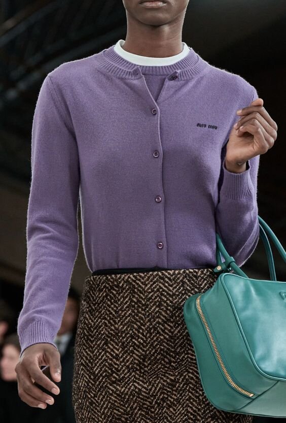 Я постаралась охватить все вязаные изделия и проанализировать, какие из них мы носим и самое главное - с чем - весной 2024 года. Так что присаживайтесь поудобнее и заварите себе чаек. Разговор не будет быстрым, но точно окажется полезным. Некоторые свитера и кардиганы заслуживают того, чтобы мы их носили круглый год, поэтому даже весной и летом часть из них не стоит убирать на дальнюю полку. И первое место в этом списке занимают небольшие офисные кардиганы как у Miu Miu, которые нужно сочетать с офисным гардеробом, застегивая на все пуговицы: юбкой-карандаш неудобной французской длины, топом внутри (парижская многослойность и главная героиня "Не родись красивой" - 2 в одном флаконе). Если не брать подиум в учет (а там всегда показывают лишь направление, но его можно переиграть, добавив своих деталей), то практичный и приближенный к нашим реалиям образ - это джинсы (широкие, прямые) или брюки в мужском стиле (можно на расслабленный манер) + футболка + кардиган с небольшими пуговицами,