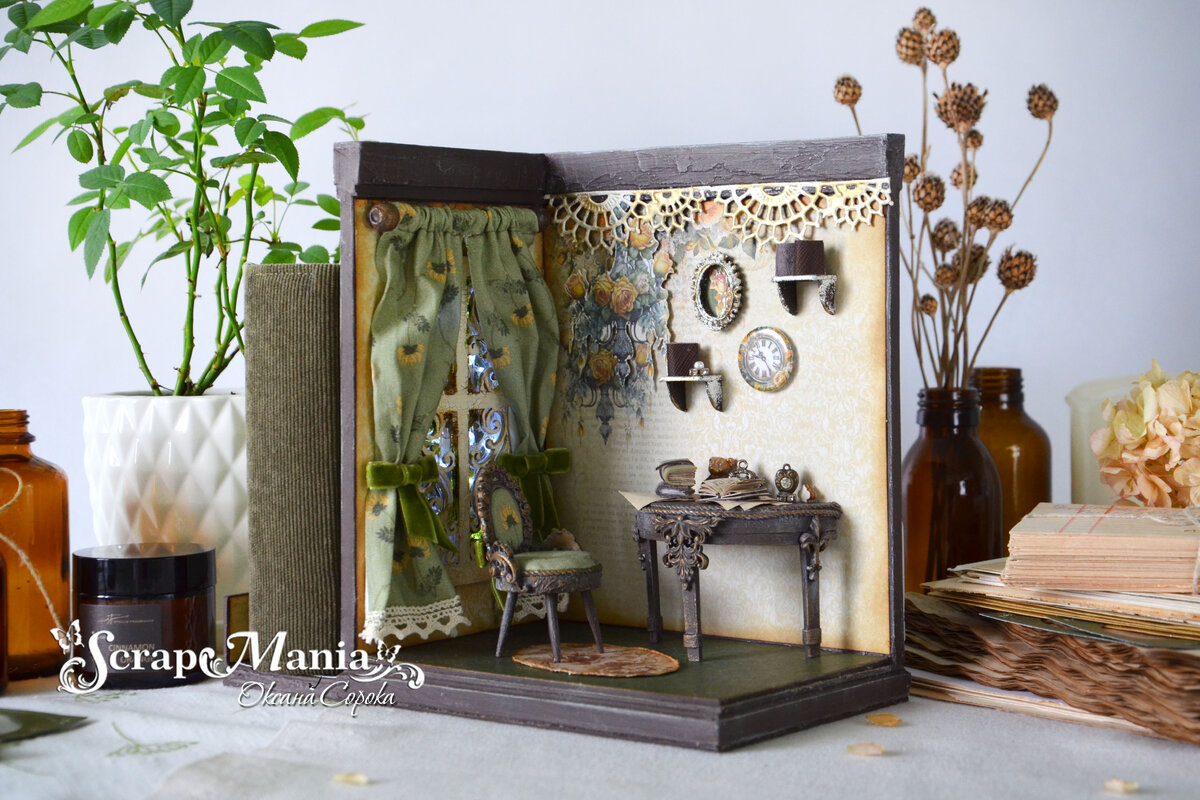 Всем большой творческий привет! Сегодня вдохновляю вас я, Оксана Сорока. Ой что я тут натворила.... Еле усидела, чтобы не разболтать всё раньше положенного времени. Поработала я с коллекцией Затерянная среди роз. Изрезала два набора и большой, и маленький, и еще немного листиков из коллекции Пивная пришлось взять. А получился у меня небольшой румбокс в стиле IX века, да еще и с блокнотом в комплекте. Ну не могу я без них, без блокнотов! На одной из стен румбокса большое окно из чипборда, в нем подсветка, а шторы из ткани крепятся бархатными бантами. Мебель из переплетного картона, пластиковых рамочек и вензелей. На столике различные предметы, книги и даже забытый плюшевый мишка. Одна книга раскрыта, как будто вот, вот кто-то вернется к ее прочтению. На стене полки с книгами, картина в рамке и часы. Шикарная люстра с крупными желтыми розами, мне конечно хотелось повесить ее (как полагается) на потолок, но исходя из возможностей конструкции румбокса она висит в углу. Но выглядит объемно,