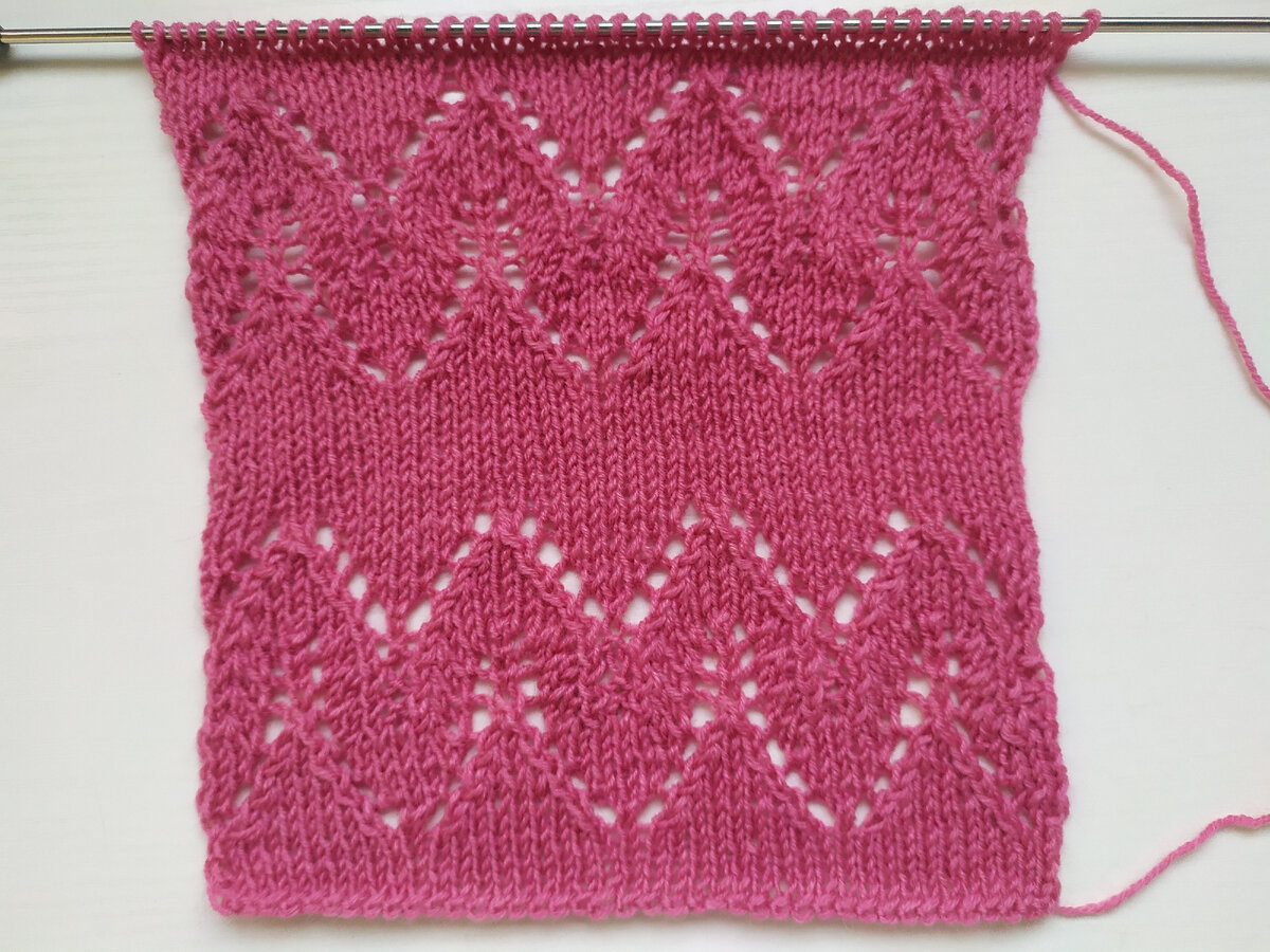 Ажурный узор смотрится одинаково красиво, если им связать полностью всё изделие или его использовать только для оформления низа рукавов и низа самой вязанной вещи. Число петель должно делиться на 10 плюс 2 кромочные петли. Описание узора Все чётные ряды вязать изнан. петлями. В начале ряда кромоч. снимать, в конце – провязывать изнан. 1-й, 3-й, 5-й ряды: кромоч., * все петли вязать лицев. * кромоч. 7-й ряд: кромоч., * лицев., накид, 2 вместе лицев. (за задние стенки), 5 лицев., 2 вместе лицев. (за передние стенки), накид * кромоч. 9-й ряд: кромоч., * 2 лицев., накид, 2 вместе лицев. (за задние стенки), 3 лицев., 2 вместе лицев. (за передние стенки), накид, лицев., * кромоч. 11-й ряд: кромоч., * 3 лицев., накид, 2 вместе лицев. (за задние стенки), лицев., 2 вместе лицев. (за передние стенки), накид, 2 лицев., * кромоч. 13-й ряд: кромоч., * 4 лицев., накид, 3 вместе лицев. (за задние стенки), накид, 3 лицев., * кромоч. 15-й ряд: кромоч., * изнан., 2 вместе лицев. (за задние стенки), 2