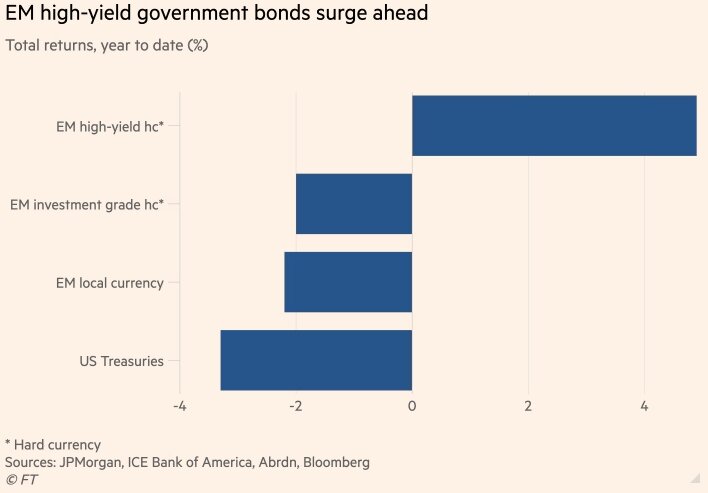 Хорошие показатели некоторых высокодоходных облигаций стран с формирующимся рынком помогли расширенному индексу суверенных облигаций стран с развивающимся рынком в иностранной валюте JPMorgan подняться на 1,4 процента. Для сравнения: индекс высококачественных мировых облигаций упал на 3%.