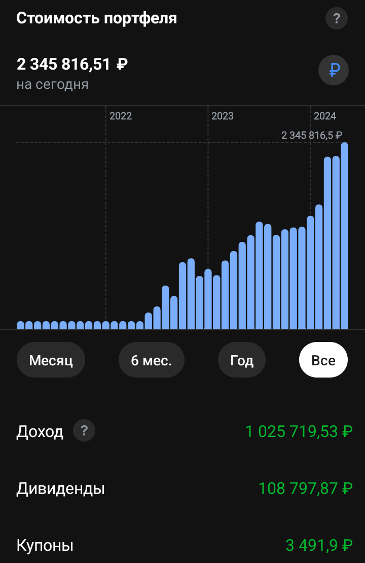Действительно, мой доход превысил отметку 1млн рублей и это без учета дивидендов. Хотел бы акцентировать ваше внимание на слове «заработал» из заголовка, оно мне категорически не нравится и сейчас я объясню почему. Слово «заработал» подразумевает, что биржа нам что-то должна, настраивает нас на неоправданные ожидания. Очень вредные ожидания, из-за которых мы можем переоценить свой вклад в рост активов. Этот пост касается только инвесторов, не трейдеров. Вторые действительно зарабатывают на бирже (большинство из них все же теряет деньги, но кто-то именно зарабатывает). Инвесторы - нет. Впервые это выражение, что «Деньги зарабатываются за пределами биржи» услышал у Бабайкина, автора книги «На пенсию в 35». Вдумайтесь в эти слова, на мой взгляд, они являются определяющими для Тру Инвесторов (не трейдеров/спекулянтов). Как только вас потянет куда-то на сторону, вспоминайте эти слова и повторяйте их как мантру. Да, моя доходность за два года перевалила за 100%. Но, что лично я сделал для эт