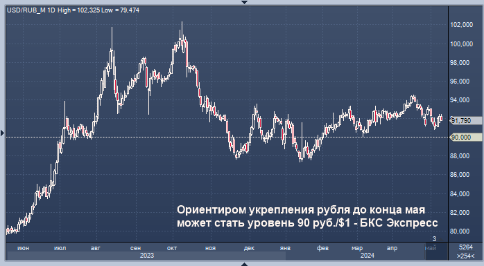 Ориентиром укрепления рубля до конца мая может стать уровень 90 руб./$1 - БКС Экспресс Курс доллар/рубля на Мосбирже интервалами в 1 минуту Курс доллар/рубля на Forex интервалами в 4 часа Возможно укрепление рубля по отношению к доллару США до уровня 90 руб./$1 до конца текущего месяца, полагает эксперт БКС Экспресс Михаил Зельцер. "Перед праздничными датами трейдеры обычно уходят в валюту, как бы снижая неопределенность выходного дня. Вернувшись к полноценным торгам, участники переоценивают актуальные риски - несмотря на перманентную жесткую геополитику, факторы валютного контроля в курсе нацвалюты явно сильнее и играют за рубль. Высокие ставки ЦБ и нормативы репатриации выручки экспортеров в принципе исключают девальвацию рубля, а временные вспышки волатильности валют быстро гасятся, - пишет аналитик в обзоре. - Вероятна очередная волна восстановления рубля после подскока "американца" к важной области сопротивления на 92,5 руб./$1. Ориентиром вниз до конца текущего месяца может высту